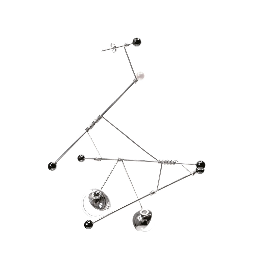 Part of Wenjin Jiang’s NIBIRU series, this kinetic earring explores sound, distance, and movement through a delicate, articulated silver structure combined with borosilicate glass, hematite, and freshwater pearls. Inspired by sound art and kinetic sculpture, the earring is designed to respond subtly to the wearer’s motion, creating gentle shifts in balance and rhythm. Named after the star Polaris, the piece reflects the collection’s focus on connection and an interconnected universe.