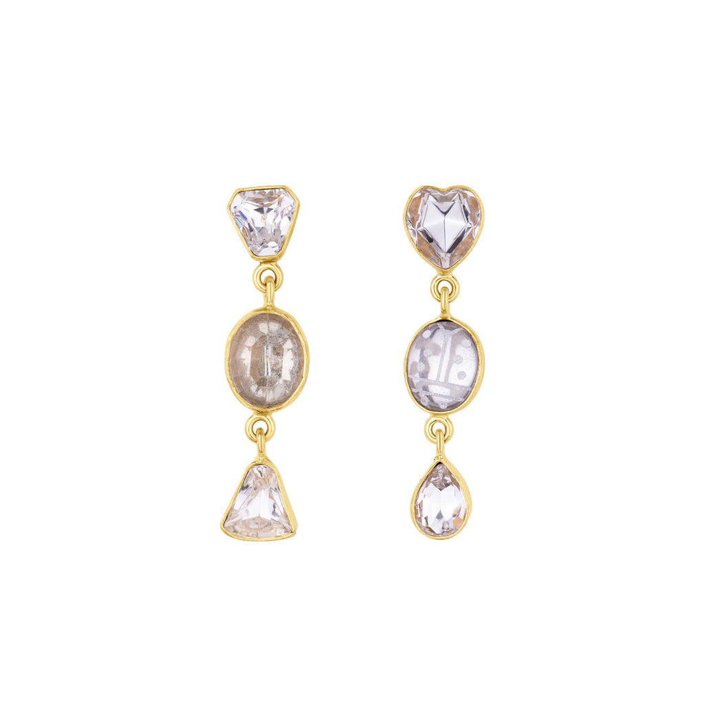 From Grainne Morton’s moving drop earring collection, these earrings bring together three individual charms arranged in a softly articulated drop. Set in Fairtrade 18k gold-plated recycled silver and featuring crystal, vintage rhinestone, and vintage glass, the composition highlights Grainne’s considered use of colour, texture, and found materials.