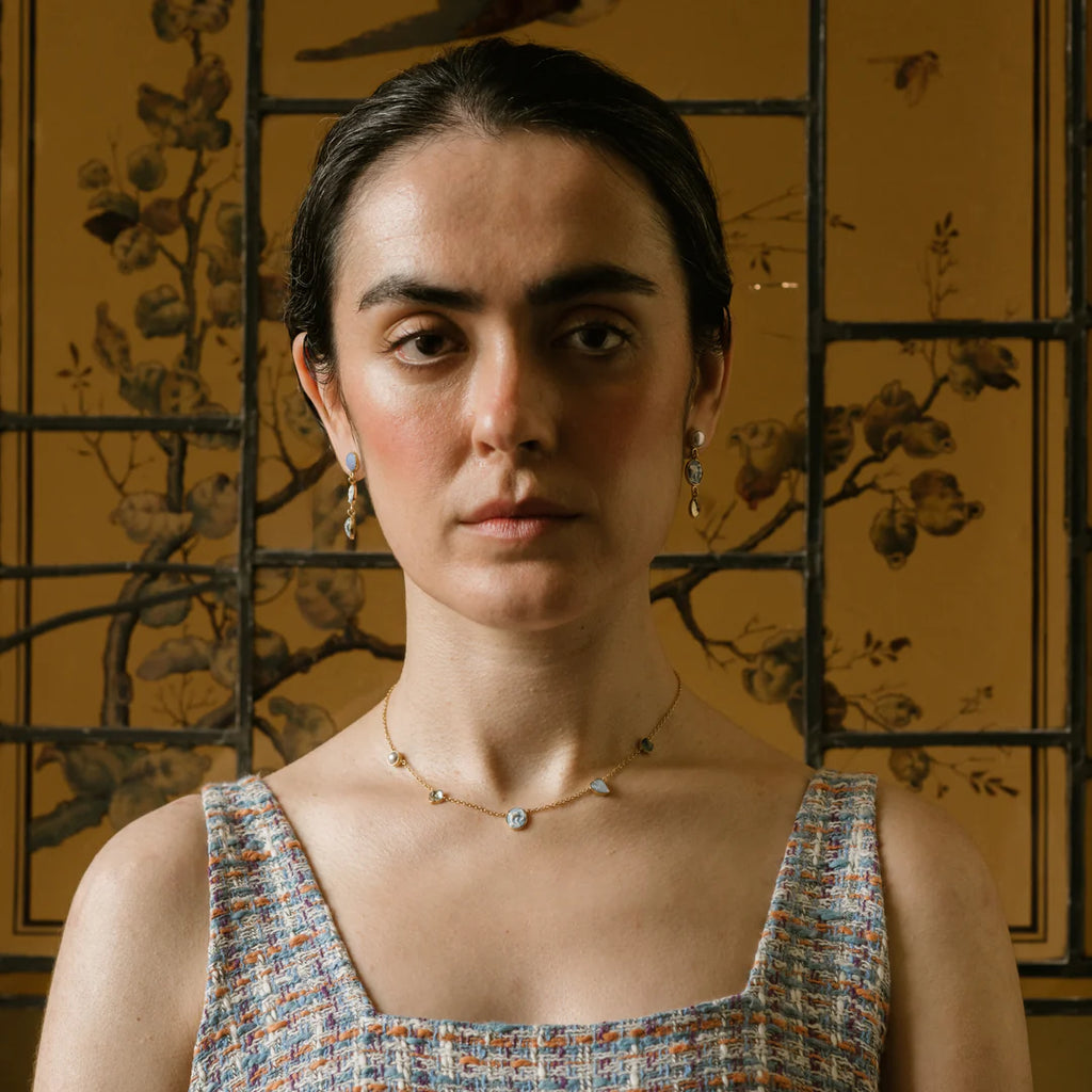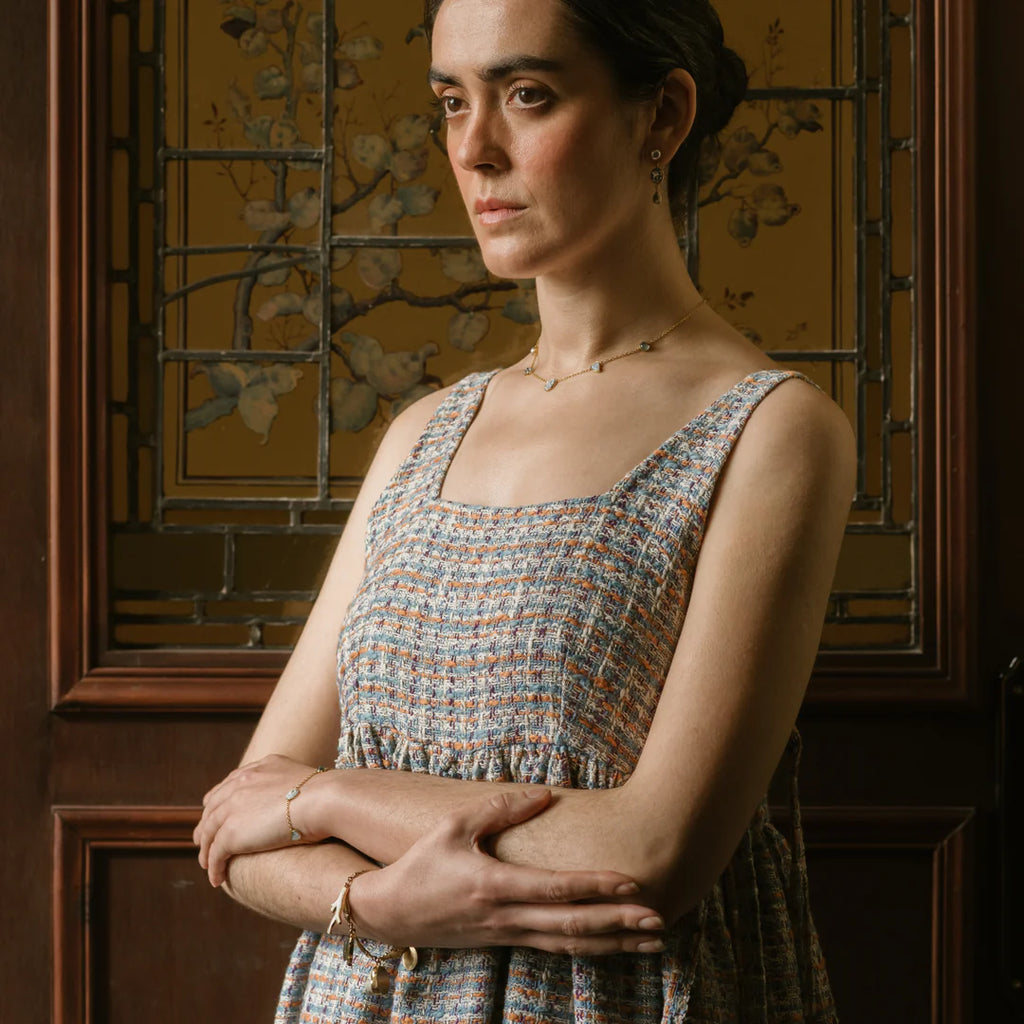 From Grainne’s moving drop earring collection, these elegant earrings each showcase three unique vintage charms. Set in Fairtrade 18k gold-plated silver and featuring pearl and topaz, they reflect a blend of natural beauty and thoughtful design.