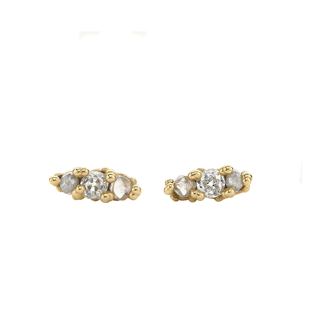 These studs feature cluster of three diamonds in complementary tones - a hand cut antique white diamond nestles alongside raw grey and champagne diamonds. Each stone is individually selected for its shape and colour to create a finished result that is harmonious and unique.