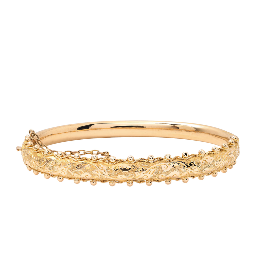 This Victorian bangle is crafted in 9ct yellow gold, with a front panel richly engraved in scrolling decoration and framed by applied rope-work and graduated gold bead detailing. The intricate surface work highlights the craftsmanship and ornamentation of the period, creating a beautifully detailed and expressive design. Its hinged construction allows it to sit comfortably on the wrist, fastening with a secure clasp and safety chain.