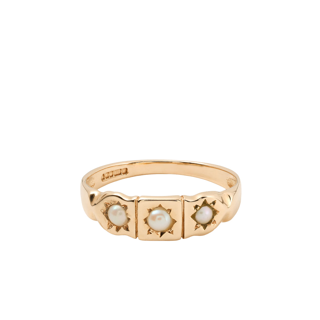 Three delicate pearls sit in a row across this 9ct yellow gold ring, each one held within engraved star settings that frame each pearl beautifully. Pearls have long been associated with love, devotion, and purity, giving this piece a timeless sense of sentiment and romance.