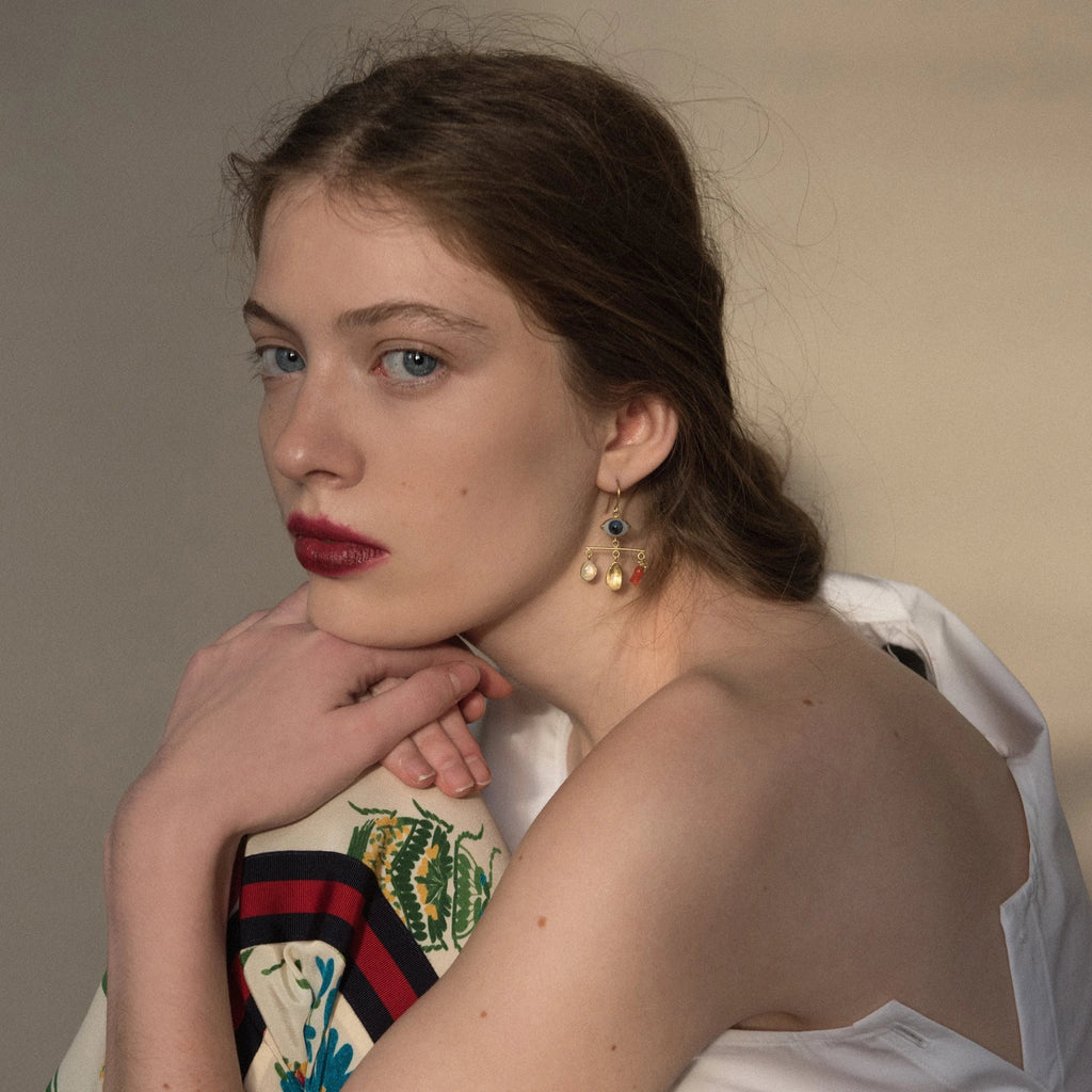 The Eye Balance Drop Earrings are from Grainne Morton's eye balance collection. An 'all seeing' vintage glass eye sits above a balanced row of gems including rainbow moonstone - which is calming, relaxing and said to encourage new beginnings.
