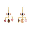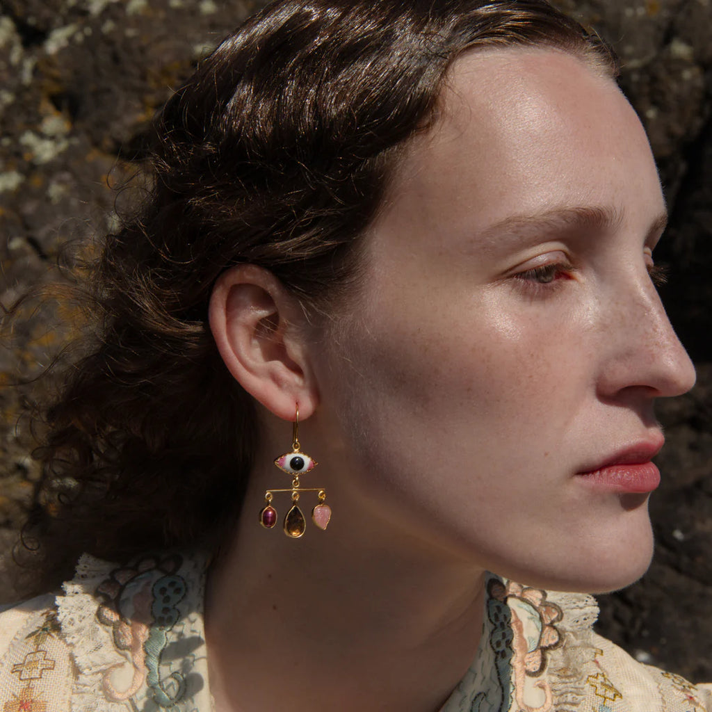 The Pink Eye Balance Drop Earrings are from Grainne Morton's eye balance collection and feature an 'all seeing' vintage glass eye above a balanced row of vintage components. The rose quartz used here brings love, self-acceptance, and emotional healing