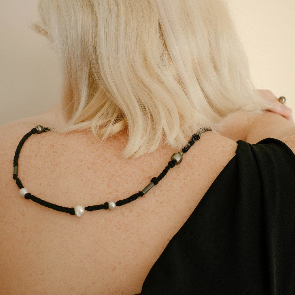The Code Ink Necklace uses different artisanal techniques to give a twist on the everyday pearl necklace. This style is made from a soft Egyptian cotton which has been woven by London-based artisan Lindey Tydeman. The hand selected pearls have been threaded onto the necklace during the knitting process, and once finished, the cord is fastened to handmade silver clasps. An easy and versatile piece that can be layered with other necklaces and worn everyday.