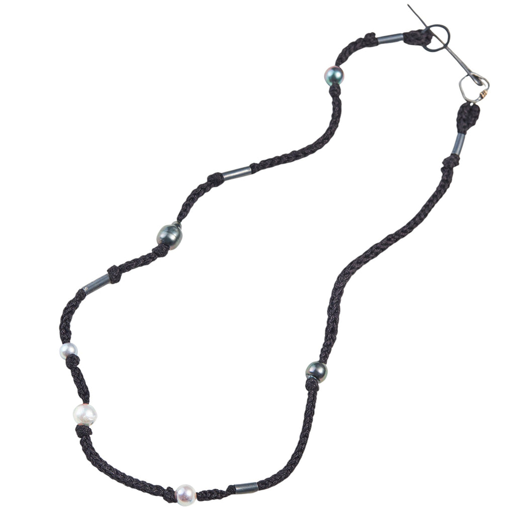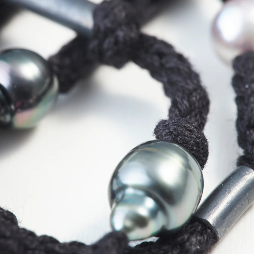 Materials: Sterling silver, Egyptian cotton, Tahitian pearl, Akoya pearl