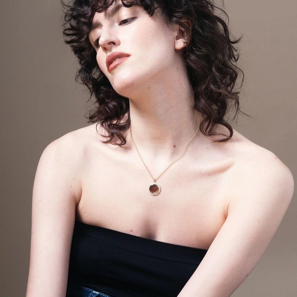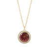 This hero pendant is crafted from 14ct yellow gold and features a rich slice of pink tourmaline and surrounded by delicate white diamonds.