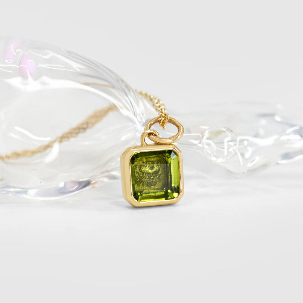 Hallmarks are the symbols applied to different metal types once tested to assure customers of a metal's fineness. Seen here through the bright and transparent peridot is a leopard's head - the symbol for London's Assay Office.