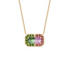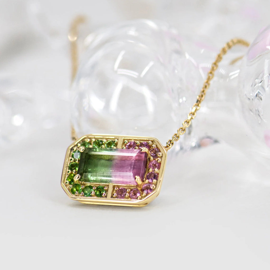 This pendant plays on the naturally occurring colour change in these unique gemstones by tracing the change from pink to green through a segmented halo of pink and green tourmaline pave.