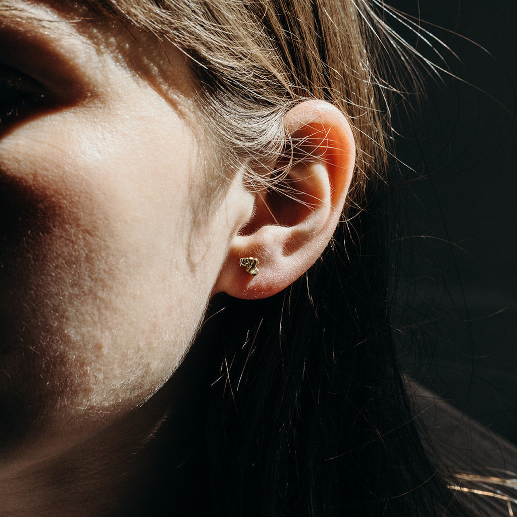These delicate stud earrings are crafted from 18k recycled gold, inspired by the captivating texture of gold nuggets in their natural form. With a soft matte finish, the organic gold nuggets embrace the sparkle of stunning diamonds. These earrings offer a refined, modern elegance and are a true testament to both craftsmanship and artistic design.