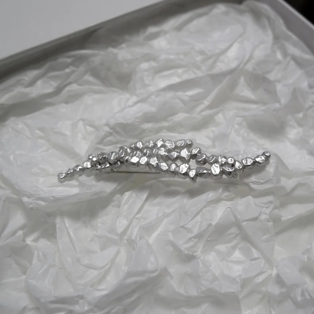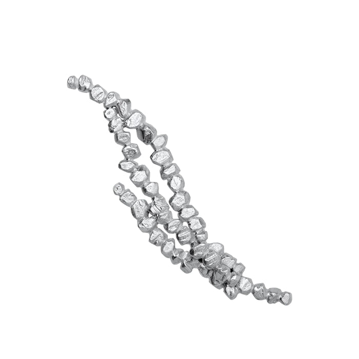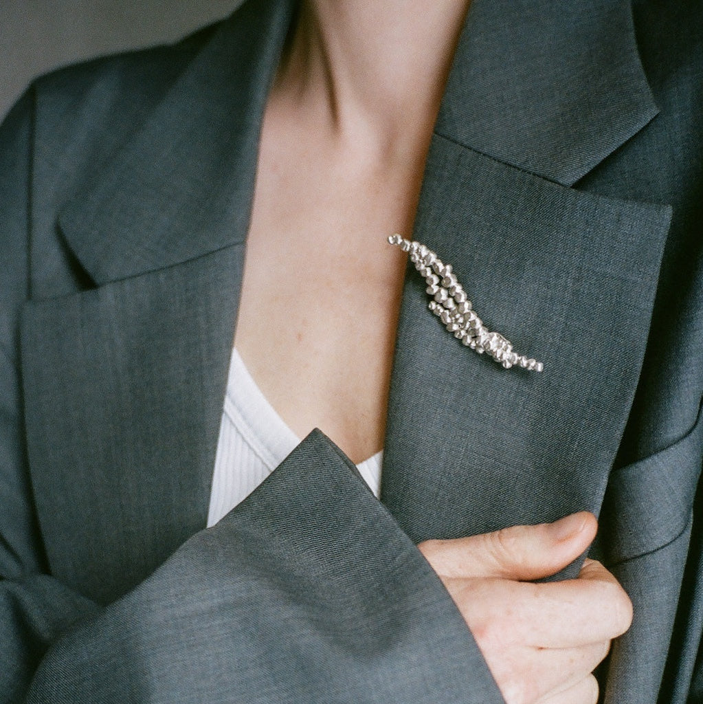 This modern take on the classic brooch is a statement piece crafted from certified recycled silver. Part of Pernille Holm’s SilverLining collection, it showcases a dynamic design of interconnected, chunky silver nuggets. The brooch is finished with a subtle brushed texture, offering a refined yet bold look. It closes securely with a pin and locking safety catch, ensuring both style and functionality.