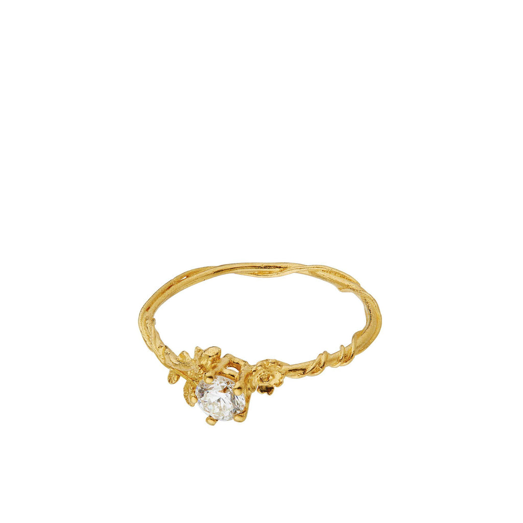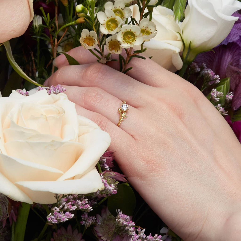 A brilliant cut diamond sparkles in this delicate 18ct gold Rosa Alba Ring, detailed with wild roses, leaves and vines. Designed as both an engagement ring or simply a luxury treasure.