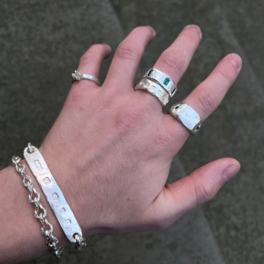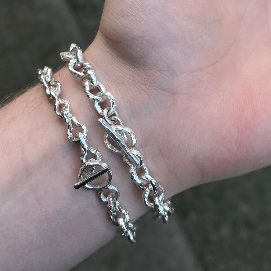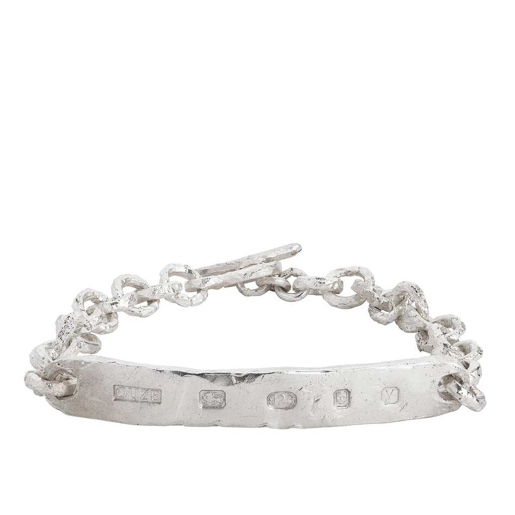 This unique Hallmark ID Bracelet features large external British hallmarking, a proud reminder of its hand-crafted history. The pairing of the external hallmarks and the handcrafted hammered links make for an alternative and unique chain, ideal for wearing with other bracelets in the collection.