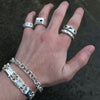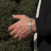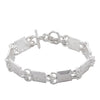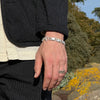 This statement bracelet has external hallmarks and features faceted square slabs of silver connected with rough double links and a T bar. Each component is cast seperately, polished and soldered together by hand - completed with a custom lock system.