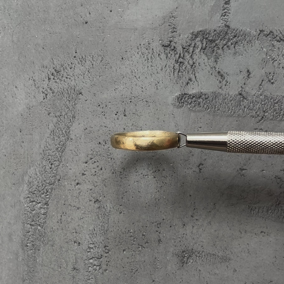 A contemporary men's wedding band with rounded edge in a lightly textured matte finish. A unique mens wedding band for those looking for a simple and comfortable design. The 14ct yellow gold suits all skin tones and is a popular option for those seeking an understated tone of gold. Ruth Tomlinson's bands are all individually handmade in her London studio - their organic shape and slightly undulating profile are evidence of this.