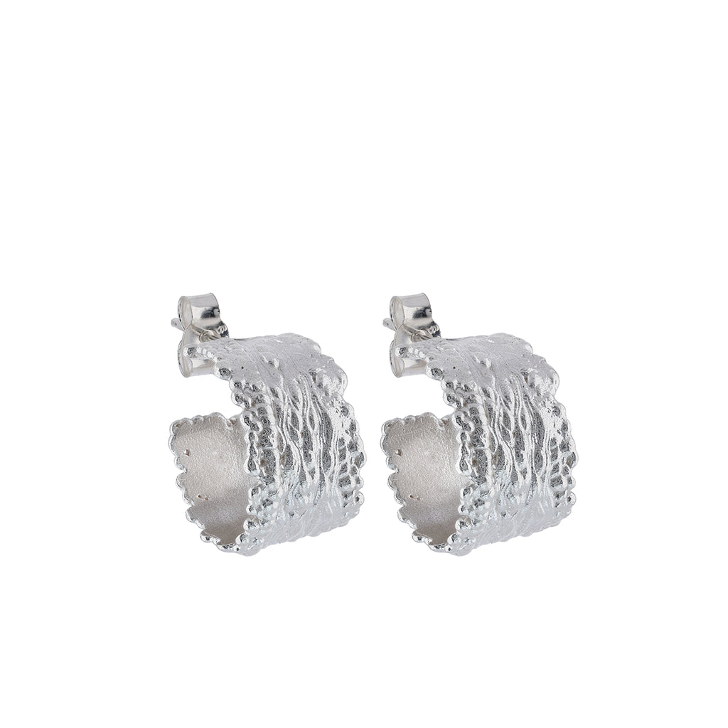 These elegant asymmetrical earrings are based on the movement and flow of water and the patterns it leaves behind on the sand. Carved and cast into sterling silver.