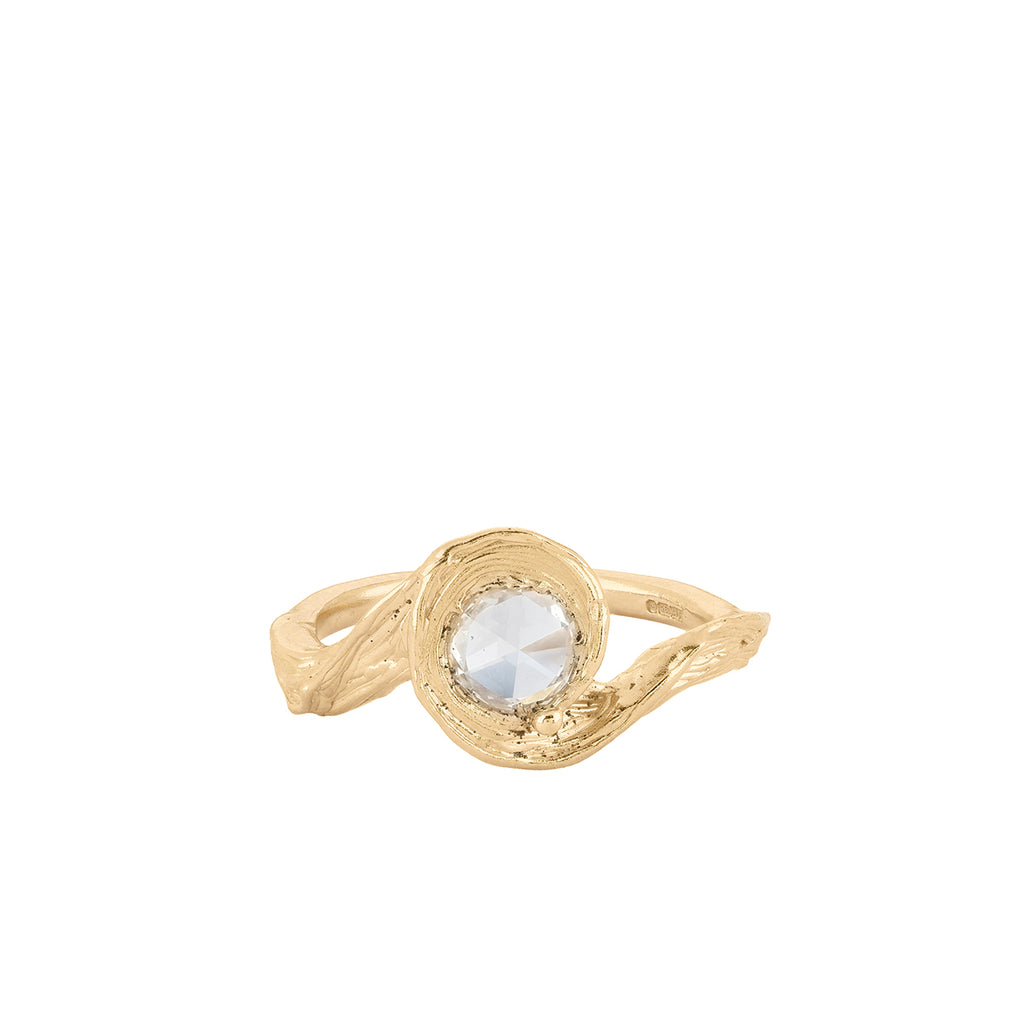The Spiral Diamond Ring flows in graceful curves of 9ct yellow gold, echoing the natural movement of water. At its centre sits a 5.5mm diamond, its brilliance accentuated by the swirling form of the band.