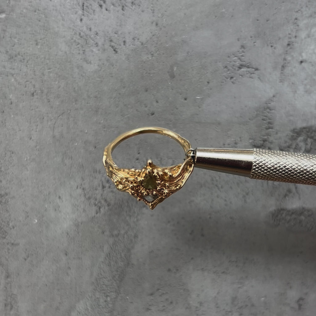 Materials: 9k yellow gold, x1 yellow pear diamond, x1 grey pear diamond