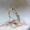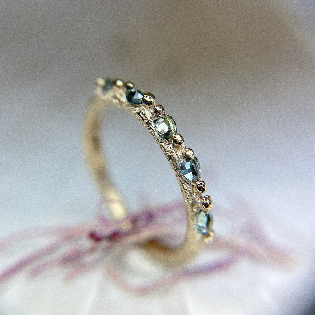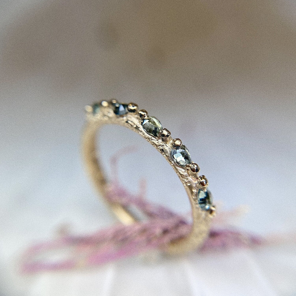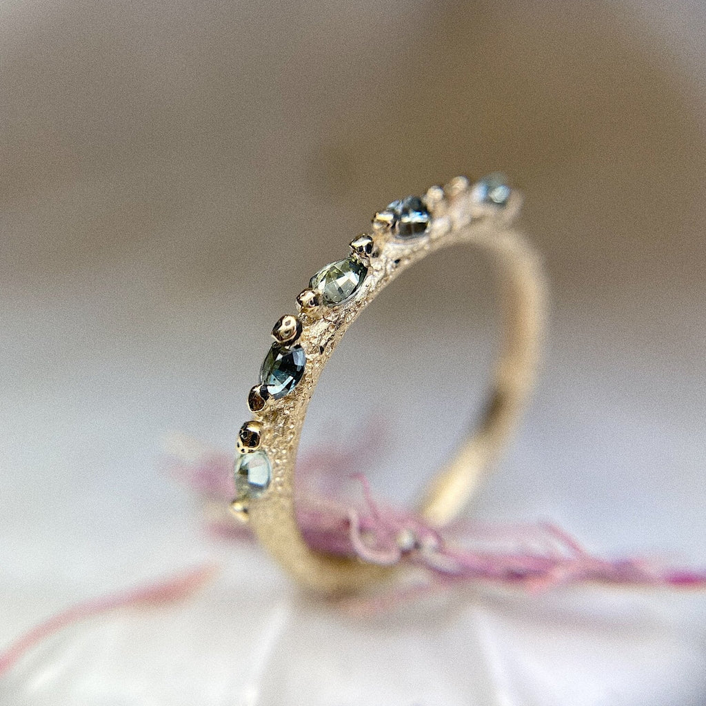 The Mermaid Ring features five seaweed green and ocean blue pear-cut sapphires set into a textured 9k yellow gold band, with organic detailing reminiscent of shell formations and life underwater. A design that captures the fluid beauty of the sea.
