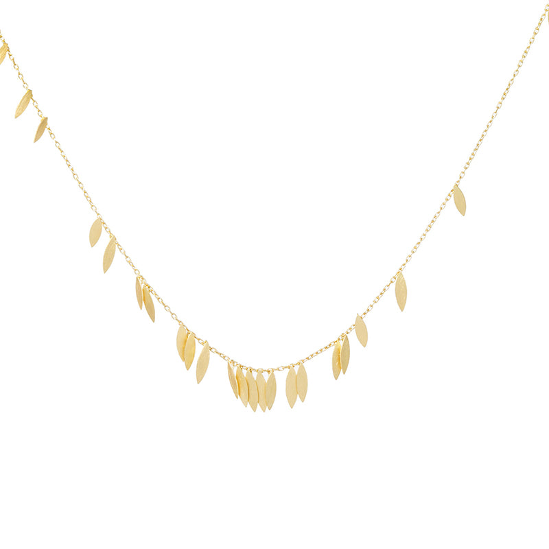 The Scattered Leaf Necklace is such an example - meticulously crafted by hand at her home studio in the Somerset countryside. Featuring a delicate chain adorned with fine hand shaped golden leaves, the necklace catches the light beautifully and shimmers in movement when worn.