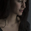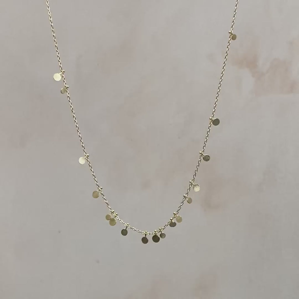 The Tiny Random Dots Necklace is such an example - meticulously crafted by hand at her home studio in the Somerset countryside. Featuring mini hammered discs sitting randomly along a fine gold chain, the necklace shimmers in movement when worn.