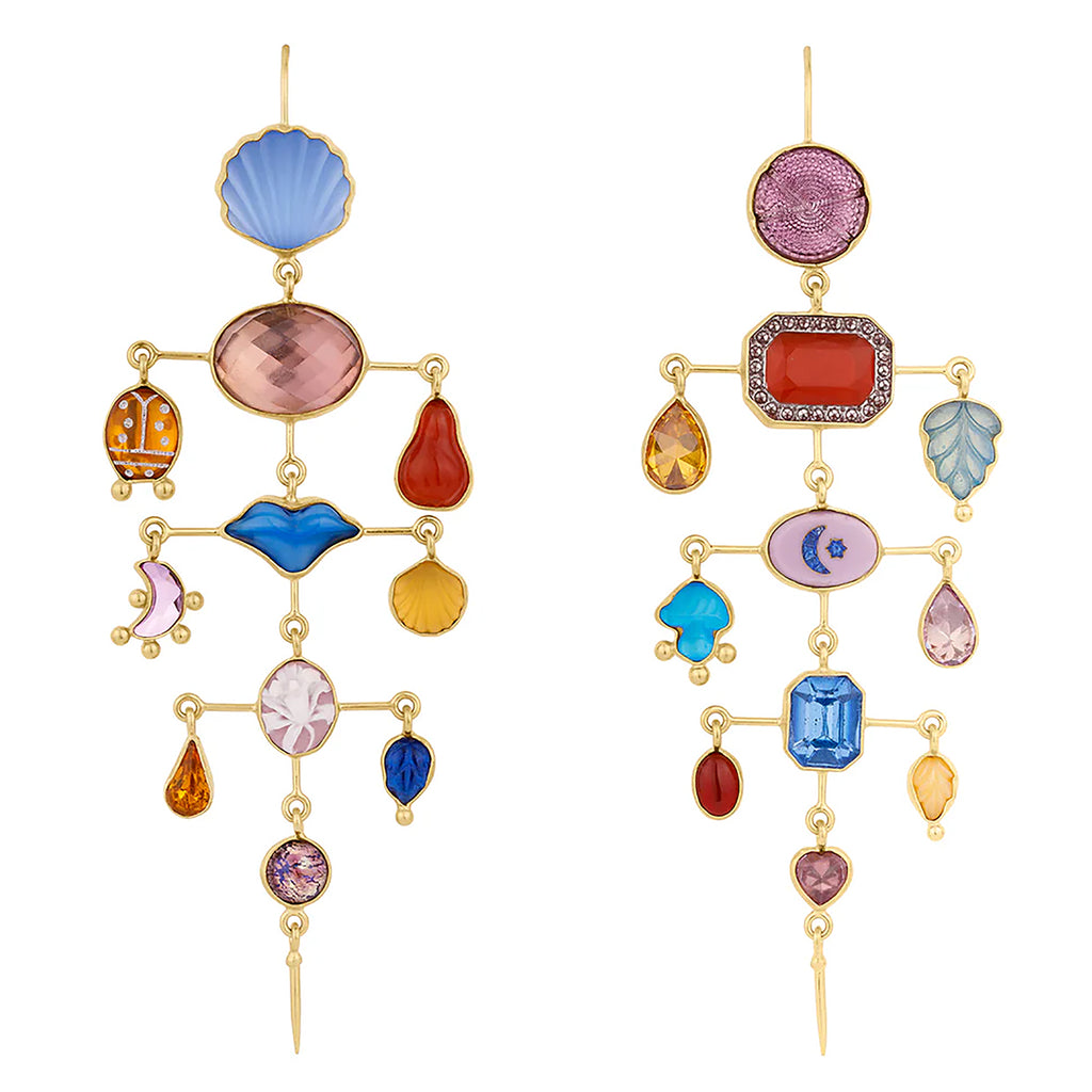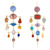 These striking earrings showcase a playful arrangement of mismatched treasures, crafted from ethically sourced 18k gold-plated silver. Vintage details are paired with gemstones such as amethyst and carnelian, creating a harmonious yet distinctive look.