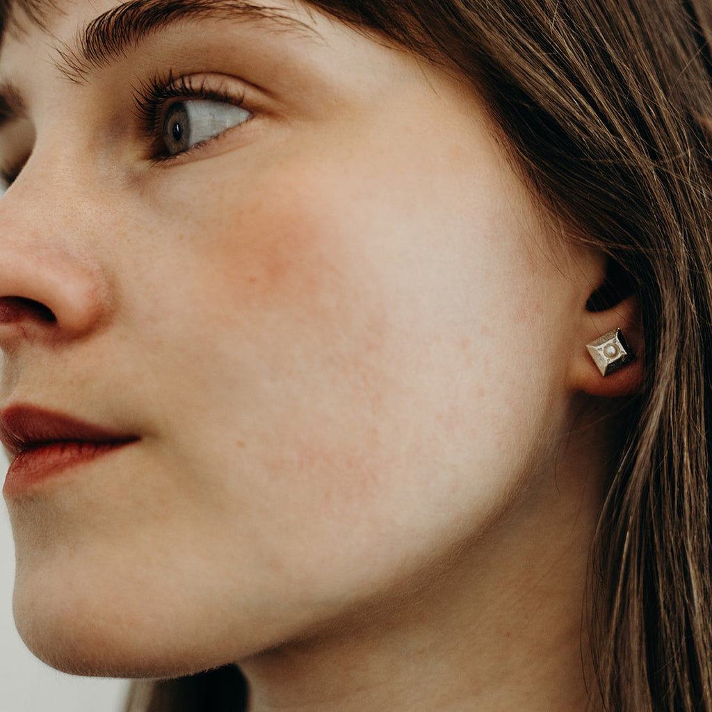 Perfect for everyday wear, this square-shaped sterling silver stud, handcrafted by The Ouze, features an elegant freshwater half pearl at its centre. Wear it solo, as a pair, or mix it with other studs for a unique combination.