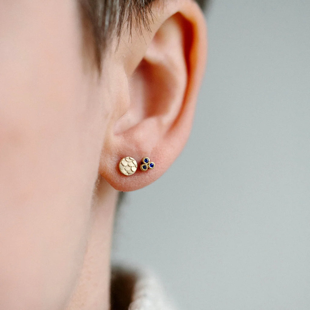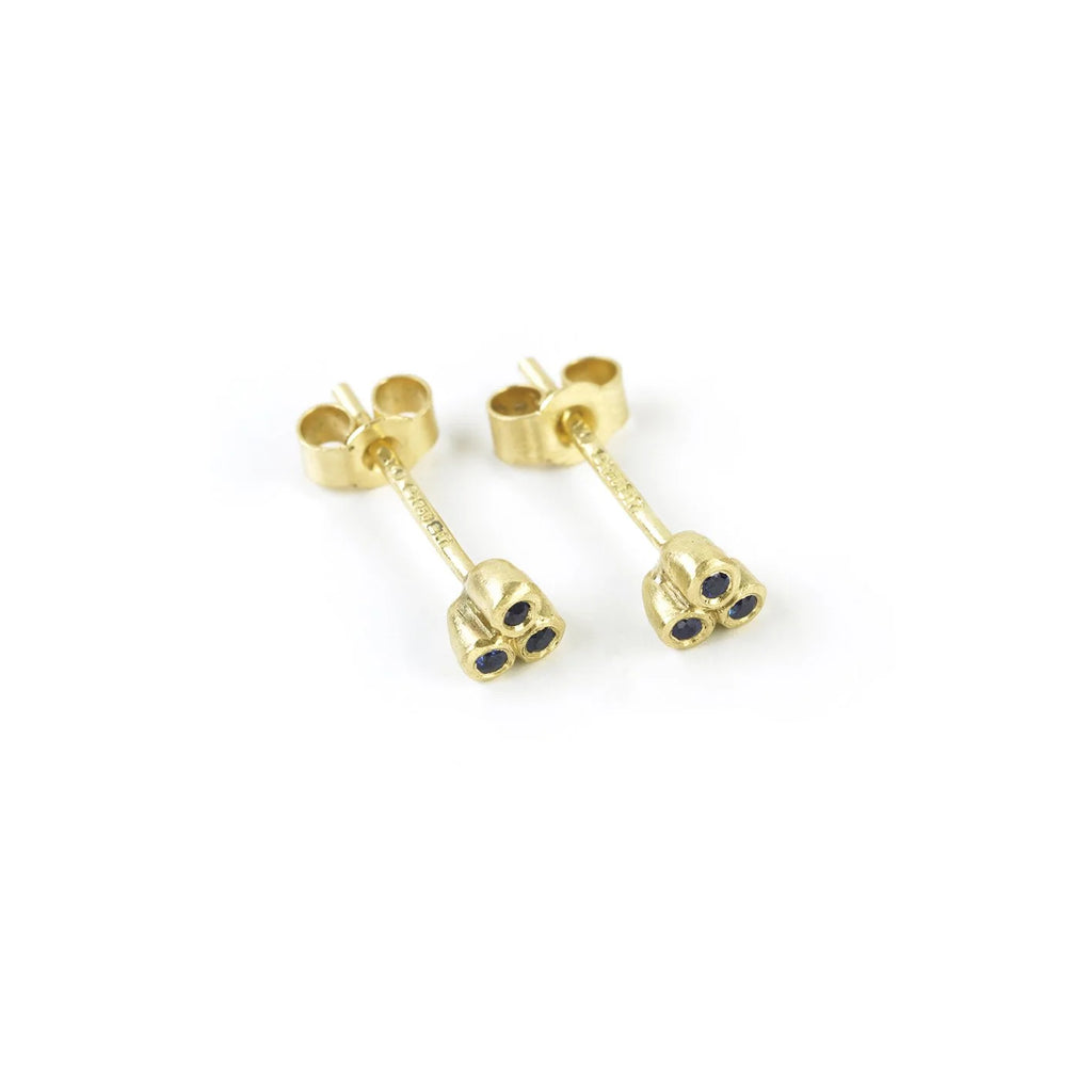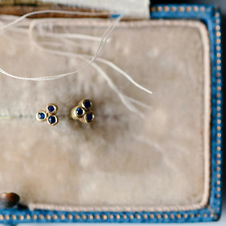 Each earring features three tiny sapphires set in a delicate tulip-like rub-over setting, forming a soft triangular cluster that catches the light beautifully. The subtle texture of the gold adds warmth to the deep blue of the stones, giving the studs a timeless and understated charm.