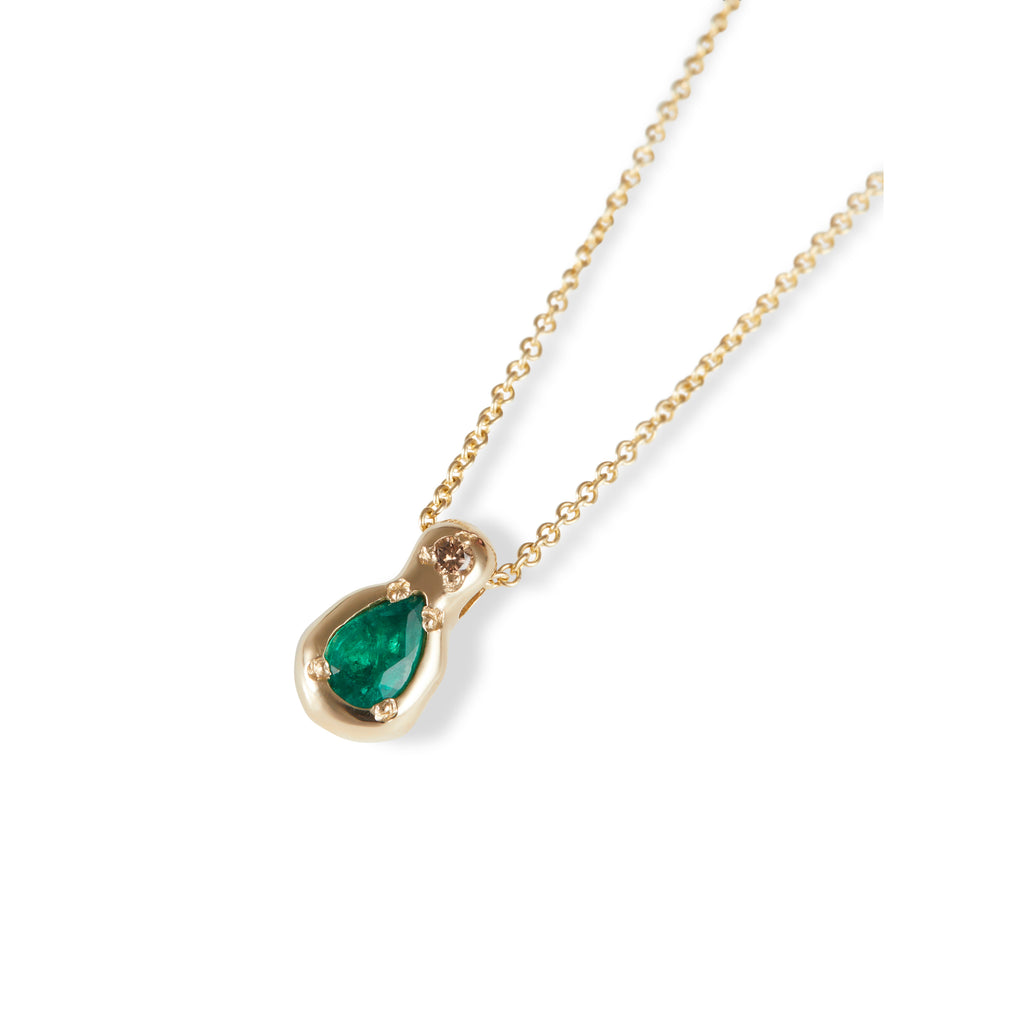 A sculptural pendant in 14ct yellow gold, set with an emerald and a brown diamond within a softly contoured gold setting.