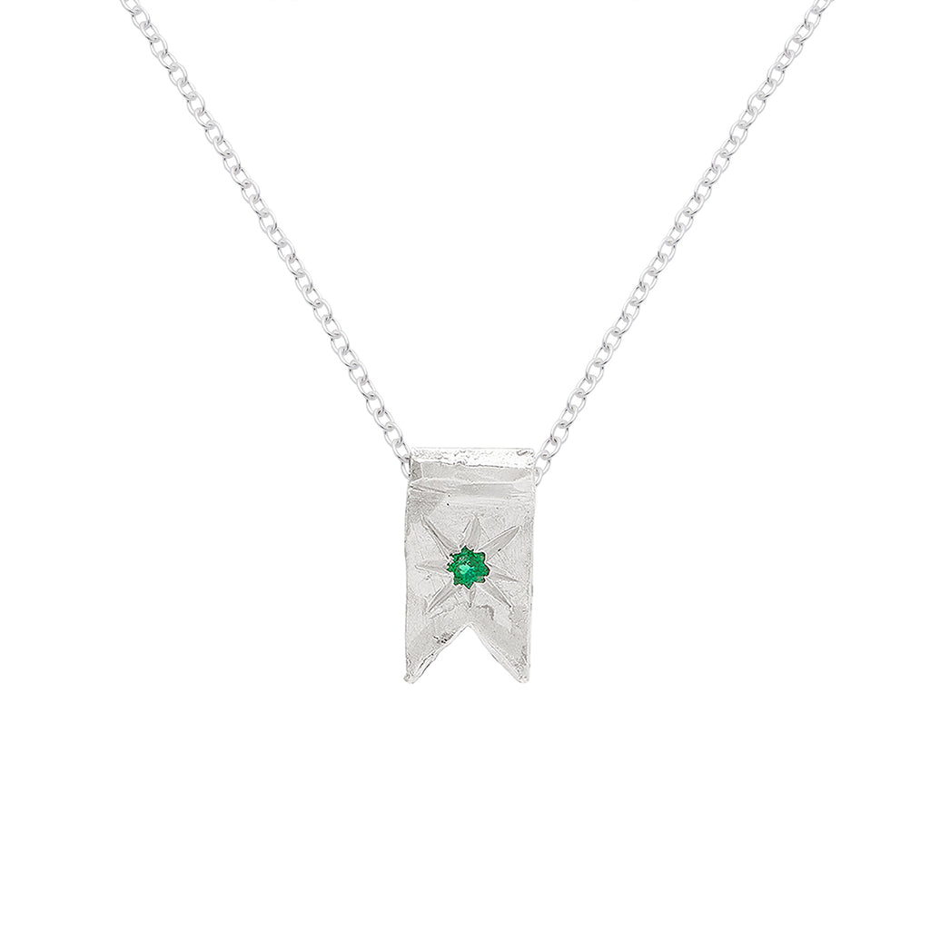 This handcrafted silver pendant takes the form of a small flag, its textured surface giving it a raw, organic feel. At the centre, a single emerald is set to catch the light, bringing a vivid green contrast against the silver. Suspended from a fine chain, the piece combines bold simplicity with subtle detail, making it a distinctive everyday pendant.