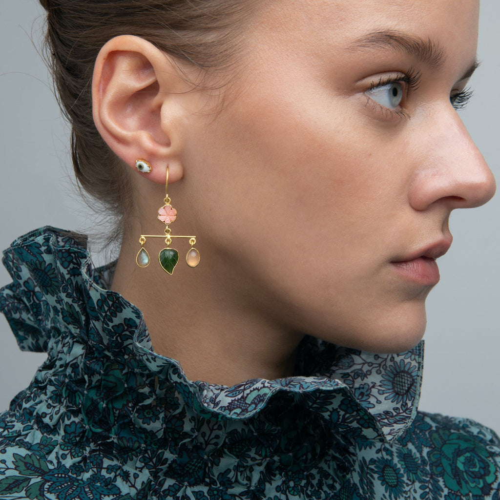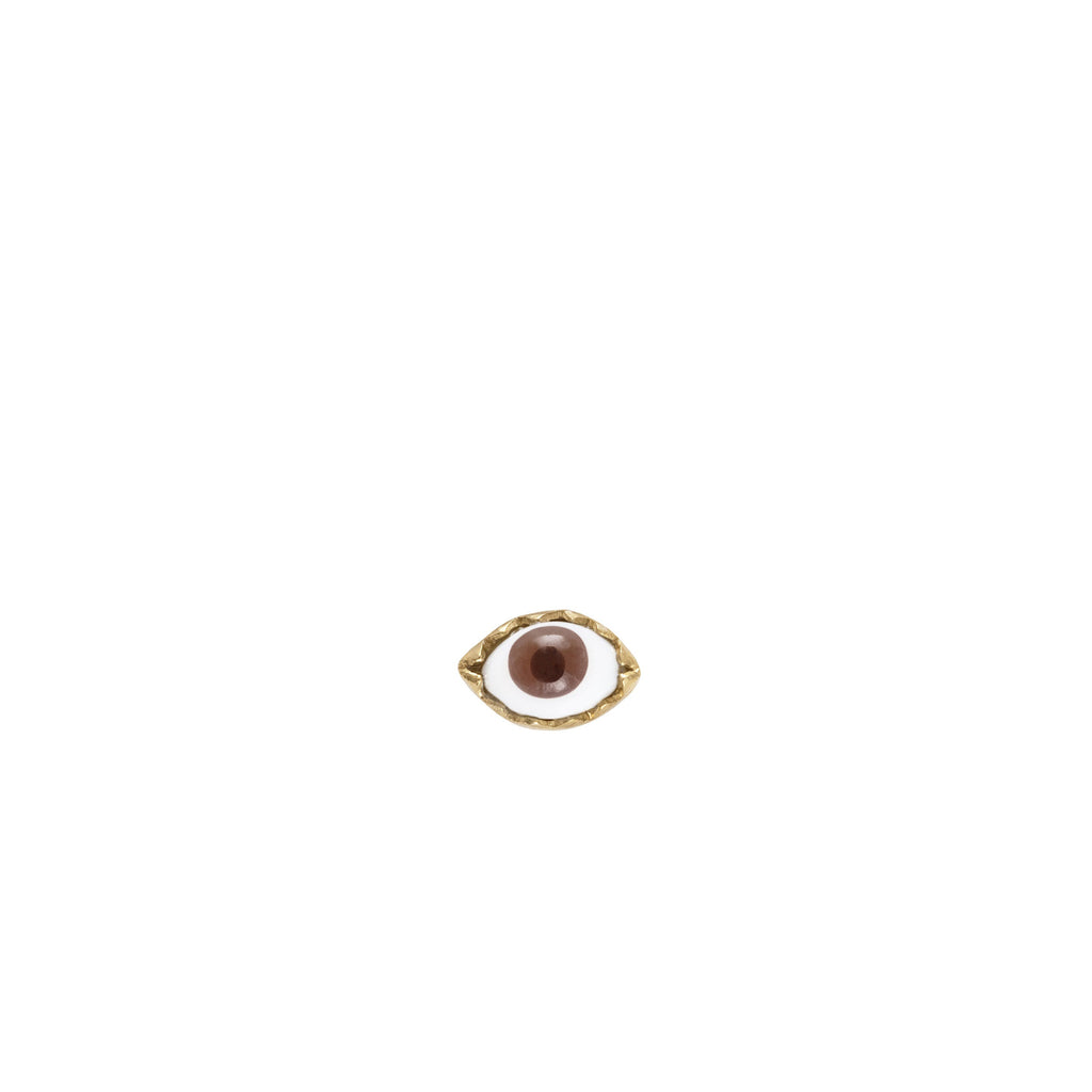 The Brown Eye single stud earring is a vintage glass component, framed by 18k fairtrade gold plated silver. A tiny delicate glass eye symbolises intelligence and truth. Grainne Morton's pieces are all handmade in her Edinburgh studio.