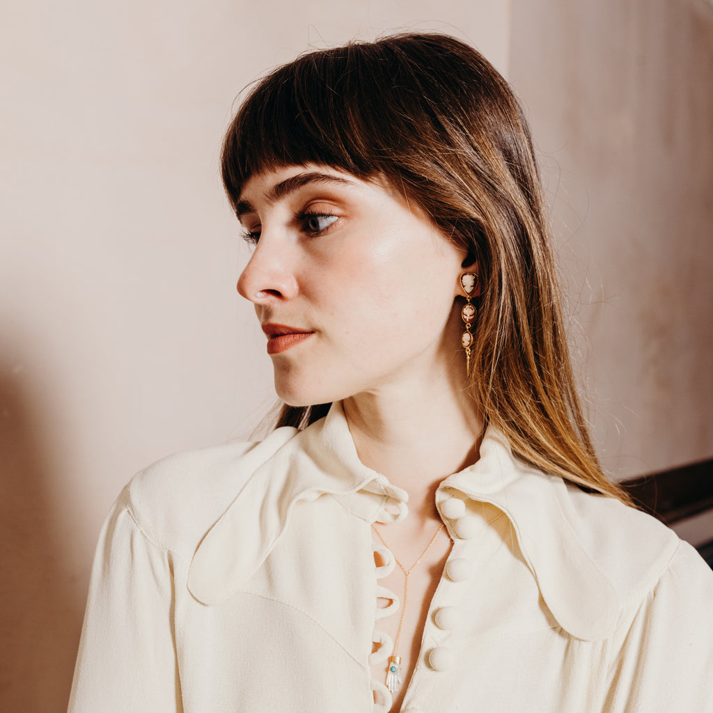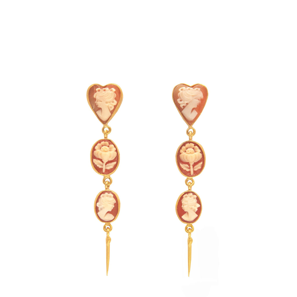 The Three Cameo Drop Earrings are a pair of elegant earrings featuring three carnelian cameos, bringing vitality, all set in 18k gold plated silver.