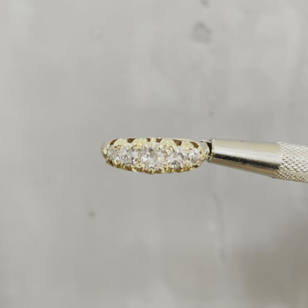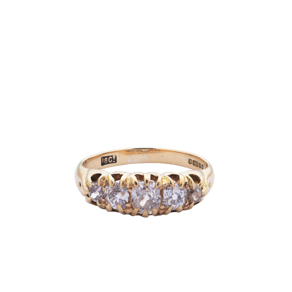 This gleaming antique ring comprises five old cushion-cut diamonds, just waiting to be paired with a beautiful modern band or worn alone in all its glory. Each cushion cut diamond is set in a very unique four prong setting, seamlessly crafted to hug the stones and keep them flush with the setting. This yellow gold band was crafted in the late 1800’s and does not show much wear for its age, a beautiful antique heirloom that has already been passed along for generations. You can add some history (and diamonds!) to your collection.