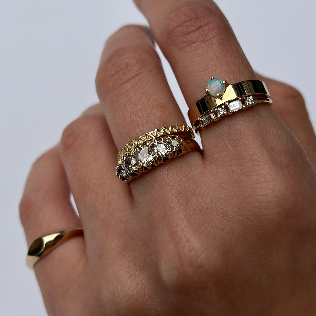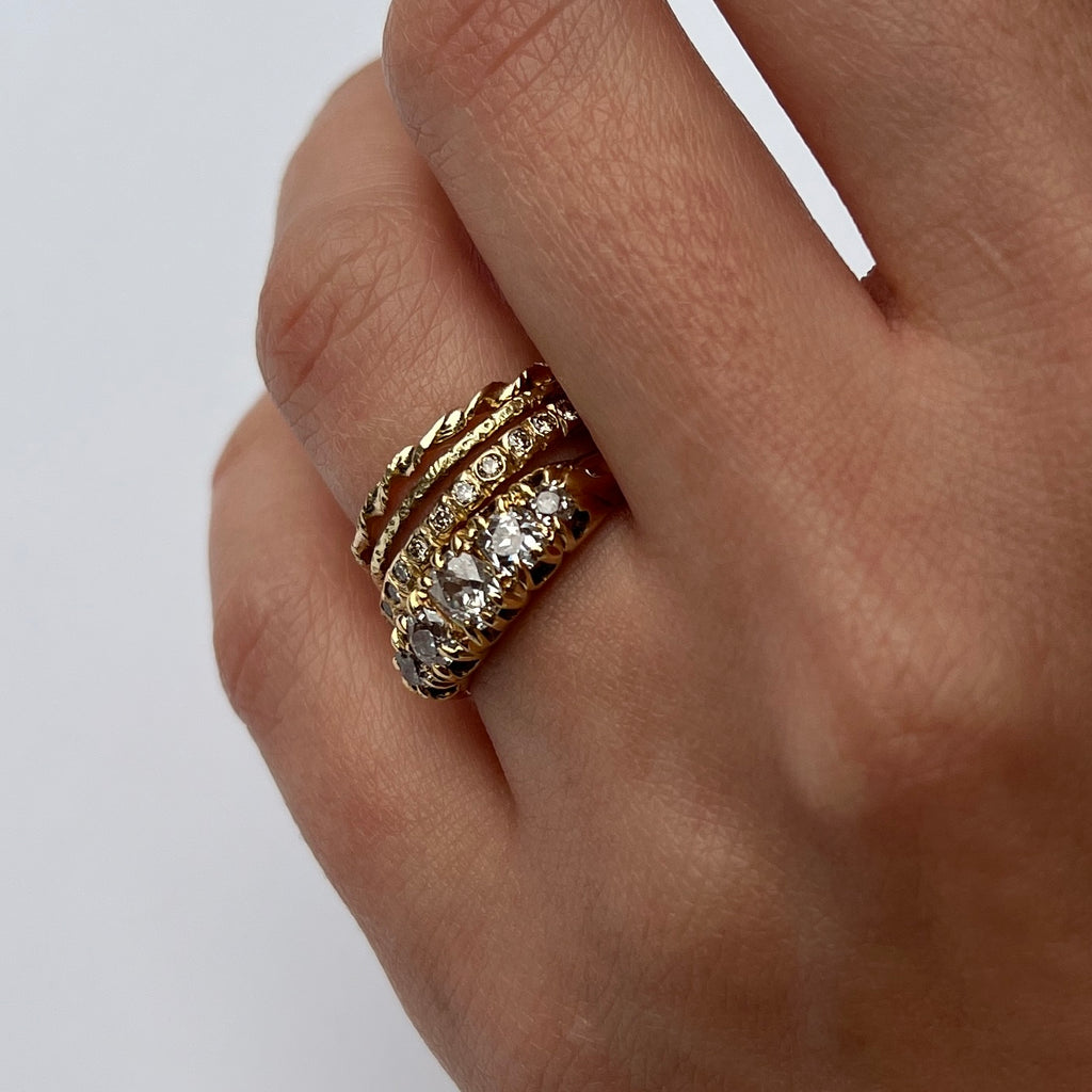 This ring styles beautifully with other antique or contemporary stacking bands, and would also make a stunning engagement ring or even a dazzling wedding band!