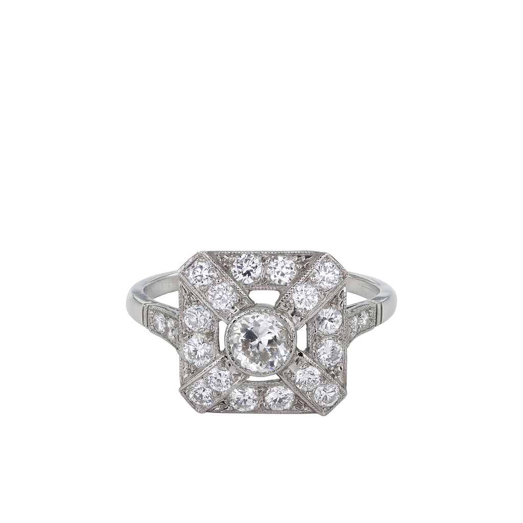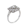 The intricate geometric design reflects exceptional craftsmanship, featuring clean lines, bold shapes, and an openwork pattern that enhances the ring’s brilliance and sophistication. The tapered band and thoughtful details give this piece a refined, architectural quality, characteristic of early 20th-century design.