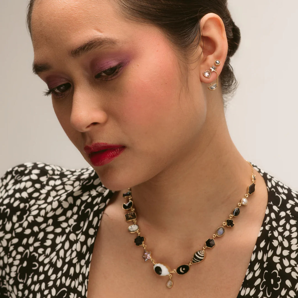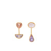 The Detachable Drop Earrings feature a mixture of blue lace agate and vintage rhinestone set in 18k gold plated silver, with detachable drops in colour co-ordinated tones. Blue agate has a grounding and calming energy and encourages reflection.