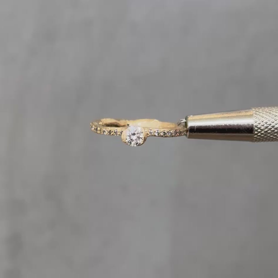 The Diamond Rowena Ring features a striking central antique diamond framed with grey pavé diamonds, delicately set on each shoulder. Crafted from 14k gold, the band’s organic texture enhances the brilliance of the diamonds, creating a captivating fusion of timeless elegance and modern artistry.