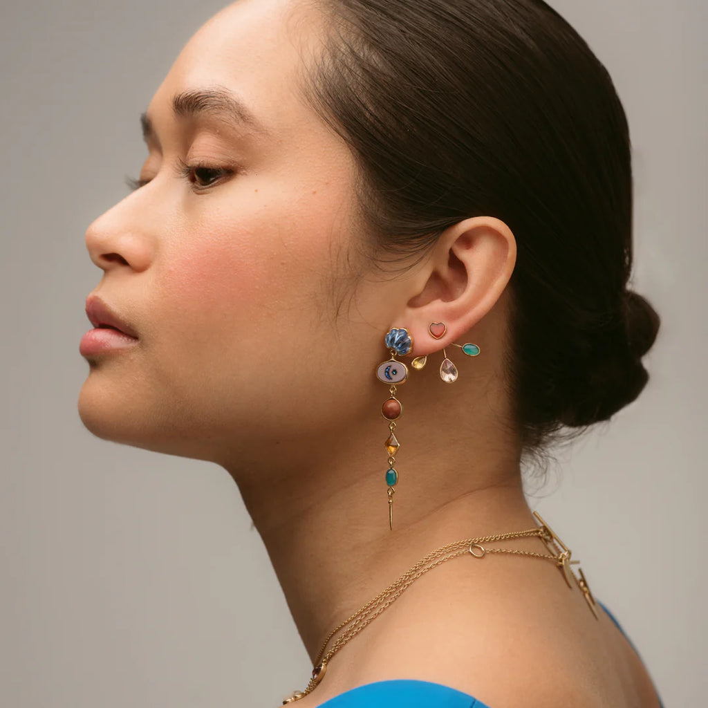 Grainne Morton’s Ear Jacket Earrings feature a delightful fan of colourful gemstones, including blue chalcedony, known for promoting emotional harmony. Set in Fairtrade 18k gold-plated silver, these earrings combine playful design with elegant materials. The stud ear fitting provides comfort, making them a stylish choice for any occasion.