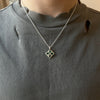 The Emerald Morris Necklace features four hydrothermal baguette-cut emeralds which are hand set in a thick, textured square pendant on a belcher chain. The rugged setting style contrasts against the striking stones, creating a standout piece.
