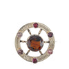 This ornate circular brooch features a richly coloured Cairngorm quartz at its centre, surrounded by six round-cut stones in deep and dusky tones. The engraved gold frame is detailed with fine foliate and geometric patterns, offering contrast and texture. Cairngorm quartz - a variety of smoky quartz traditionally sourced from the Scottish Highlands - has long been associated with protection, endurance, and strength, lending symbolic weight to this striking piece.