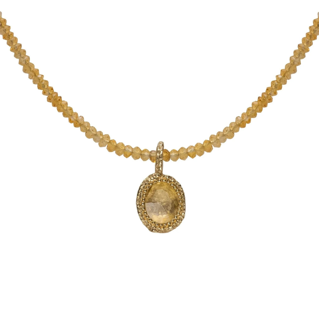 One-of-a kind rose-cut faceted pale yellow sapphire slice (8 x 6mm), set in a solid 9ct gold stiched texture pendant. Paired with an 18" necklace of 3mm faceted citrine gemstones.