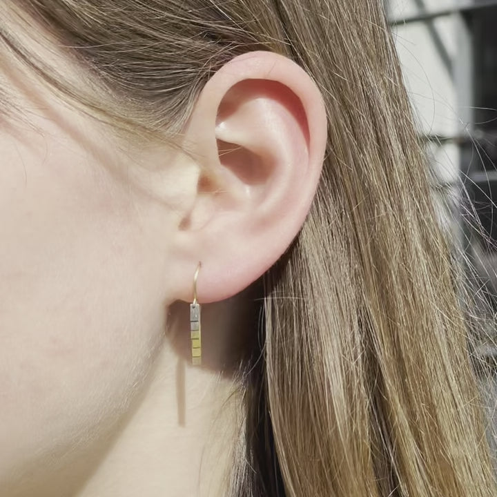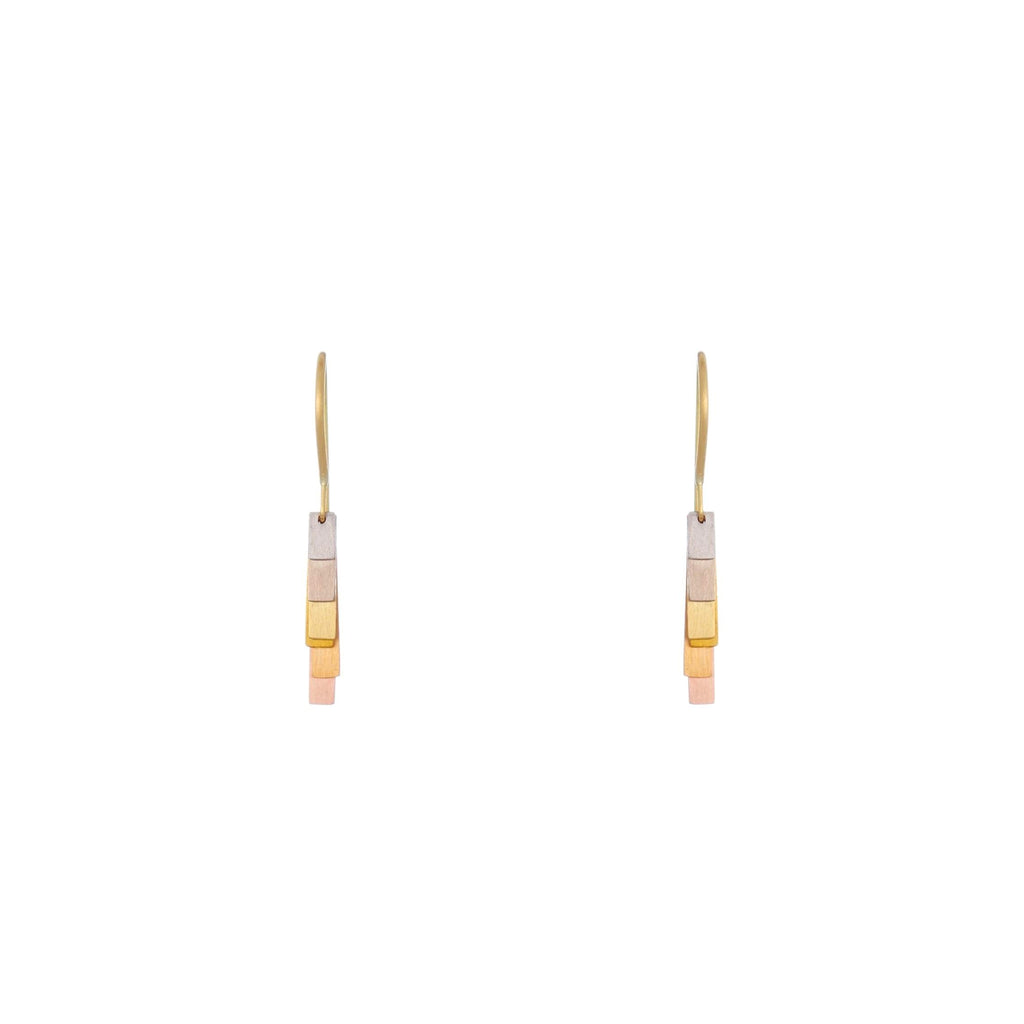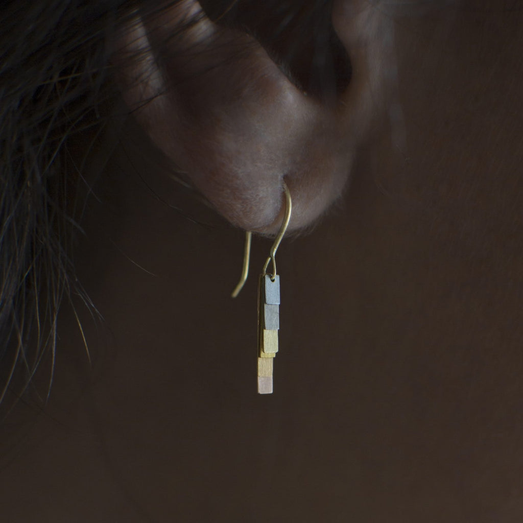The Little Rain Earrings are such an example - metic­u­lous­ly craft­ed by hand at her home studio in the Somerset countryside. Featuring layers of grad­u­at­ing rec­tan­gles of rain­bow gold, the earrings shimmer in movement when worn.
