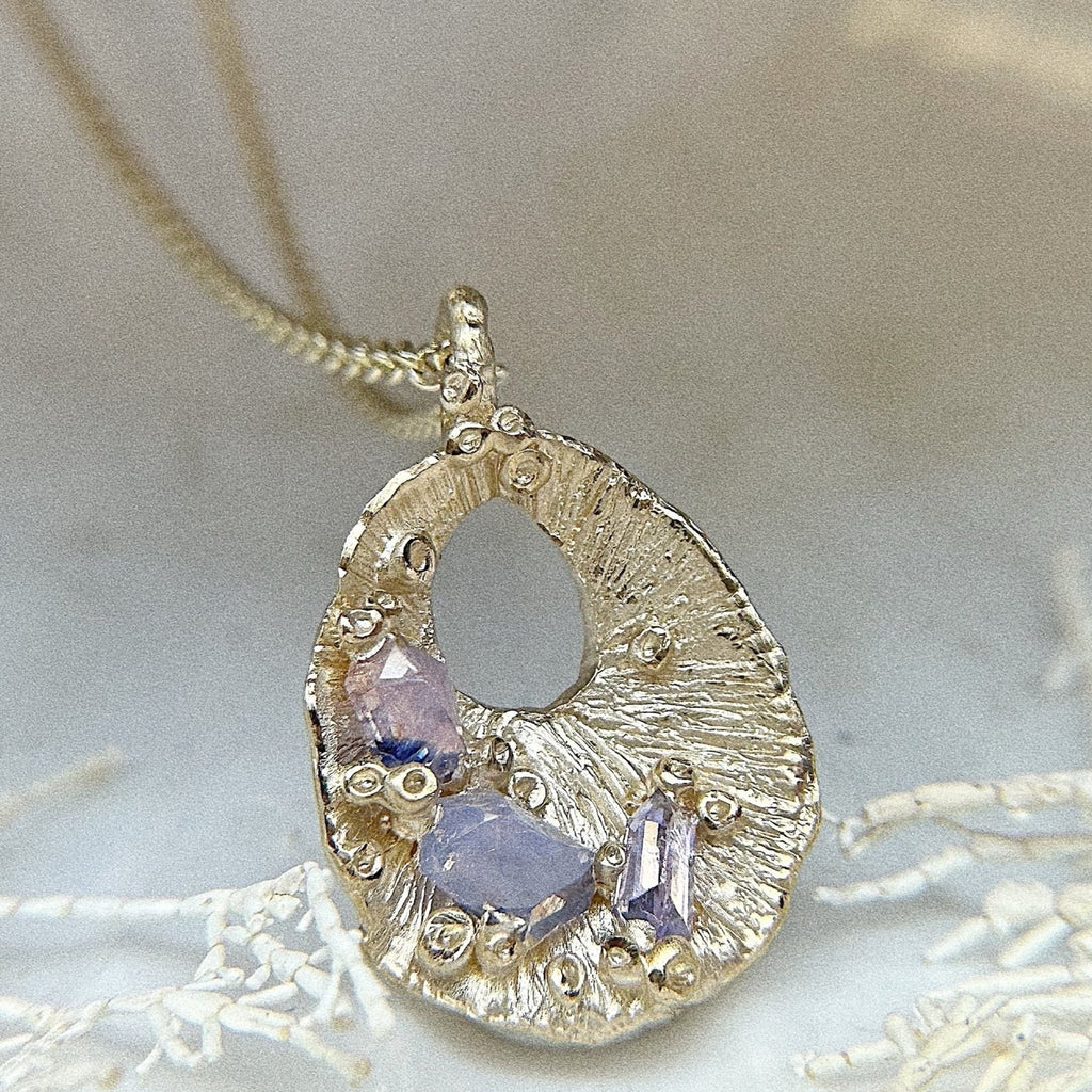 The Marloes Sands Limpet Pendant captures the beauty of the shoreline in 9k yellow gold, with intricate texturing inspired by the natural form of a limpet shell. A cluster of pastel-toned sapphires nestles among golden barnacle details, creating a unique ocean treasure that feels as if it was found along the tide’s edge.