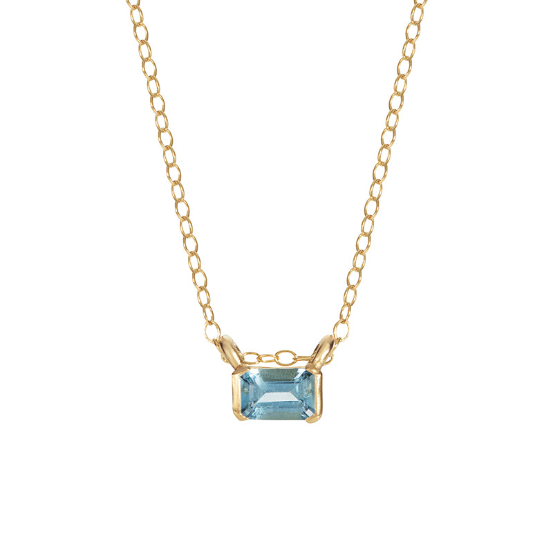 The Salila Aqua Deco Pendant is handcrafted and features one charm: an emerald-cut aquamarine. Suspended from a fine chain, this aquamarine has a beautiful, tranquil colour that contrasts perfectly with the gold.