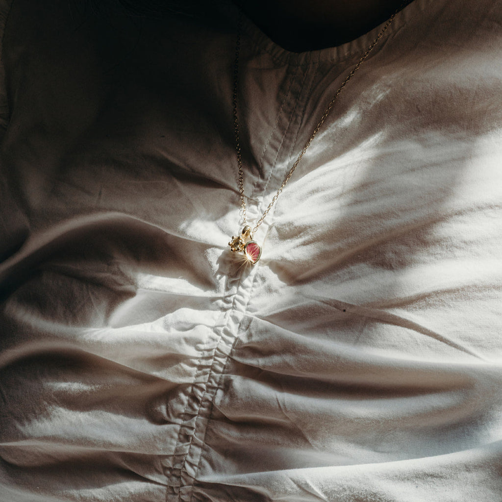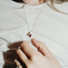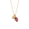 The Aditi Ruby and Diamond Necklace is handcrafted and features two charms: a champagne diamond and a ruby. Suspended from a fine chain, this pear shaped ruby has a beautiful, luminous colour that contrasts perfectly with the diamond.